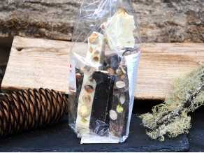 Sachet de chocolat cassé Amandes, noisette, pistache, orange Fabrication artisanale à Samoens en Haute-Savoie